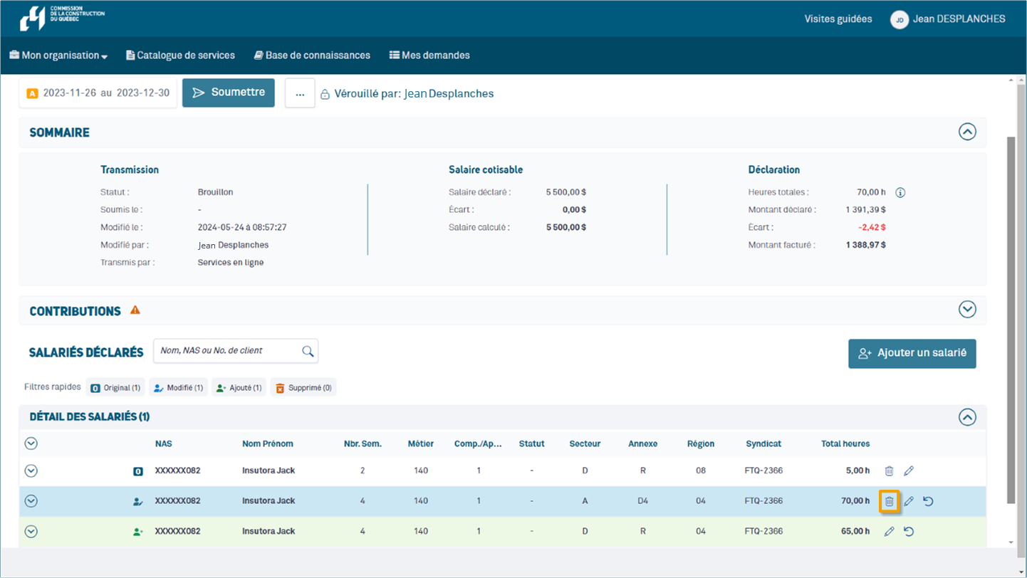 - Cliquez sur l’icône « Supprimer la ligne », représentée par une corbeille, pour effacer les informations de ce salarié du rapport mensuel.