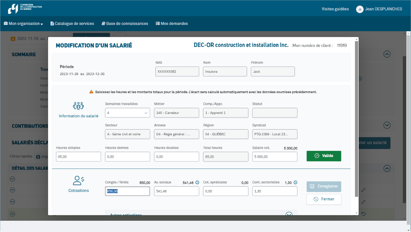 - Cliquez sur « Valider » pour vérifier la nouvelle information entrée et calculer les nouvelles cotisations