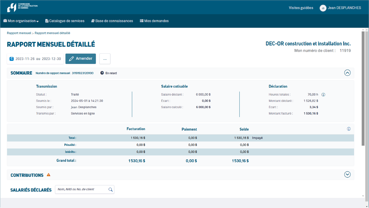 Un rapport amendé affichera un statut « traité » s’il a été accepté par le système. Il affichera un statut « en traitement » si les modifications apportées doivent être revues et approuvées par un agent de la CCQ. En cas de rejet, un agent communiquera avec vous.